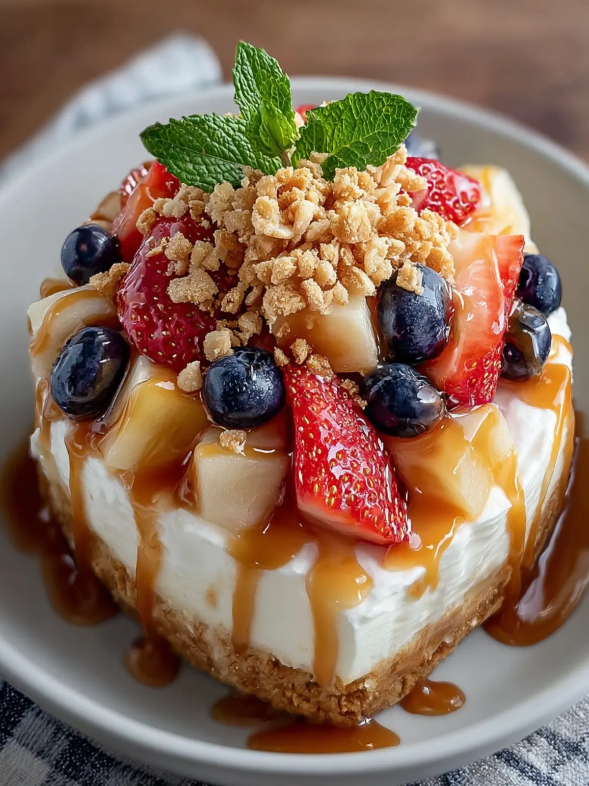 A refreshing dessert combining cream cheese and fresh fruit, drizzled with caramel and topped with granola.