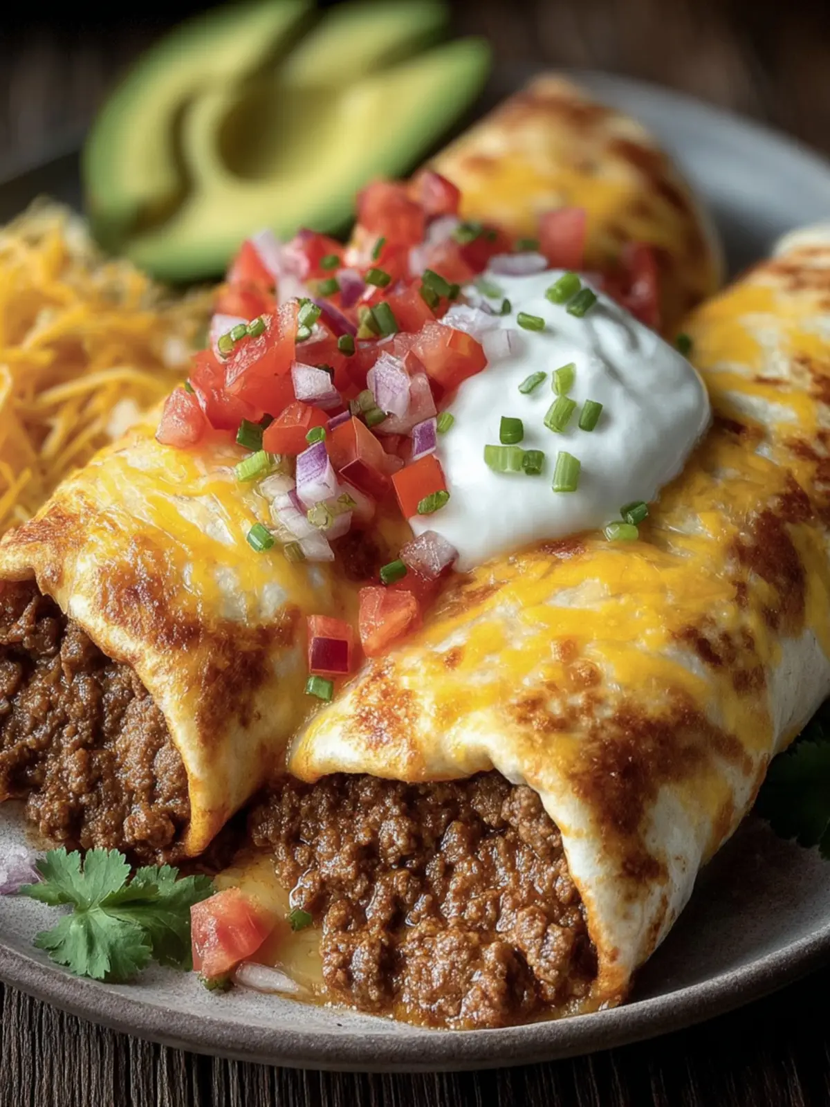 Delicious cheesy beef burritos filled with savory ingredients and topped with fresh accompaniments.
