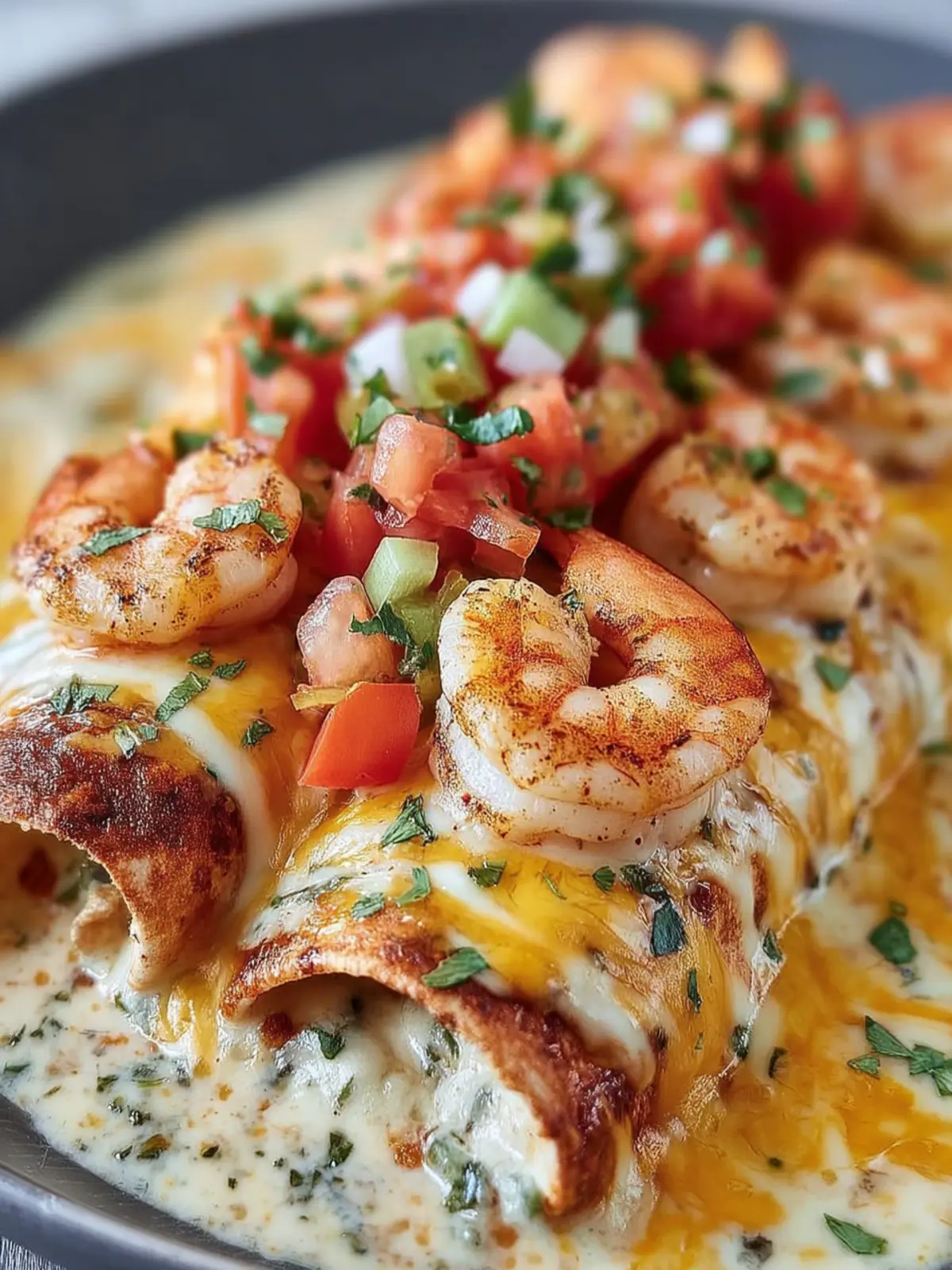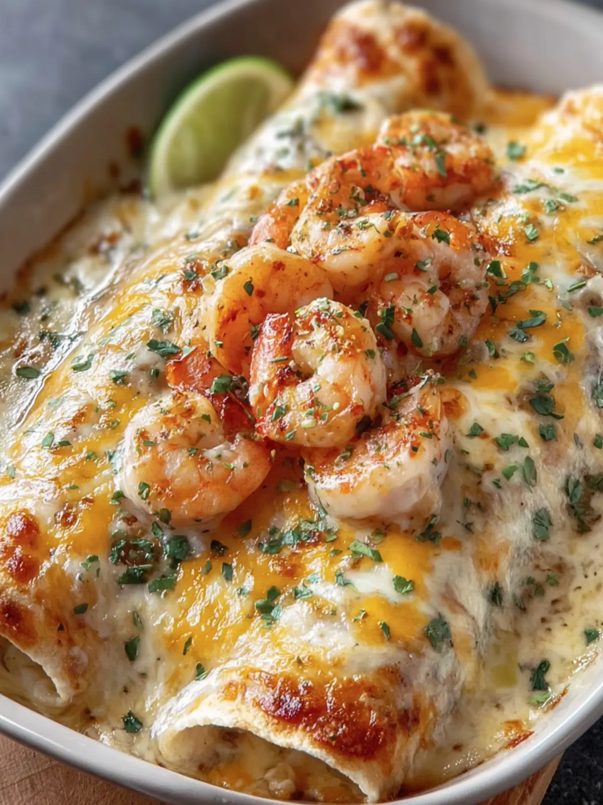 A delicious cheesy shrimp enchilada dish that brings together shrimp, tortillas, and a creamy sauce topped with melted cheese.