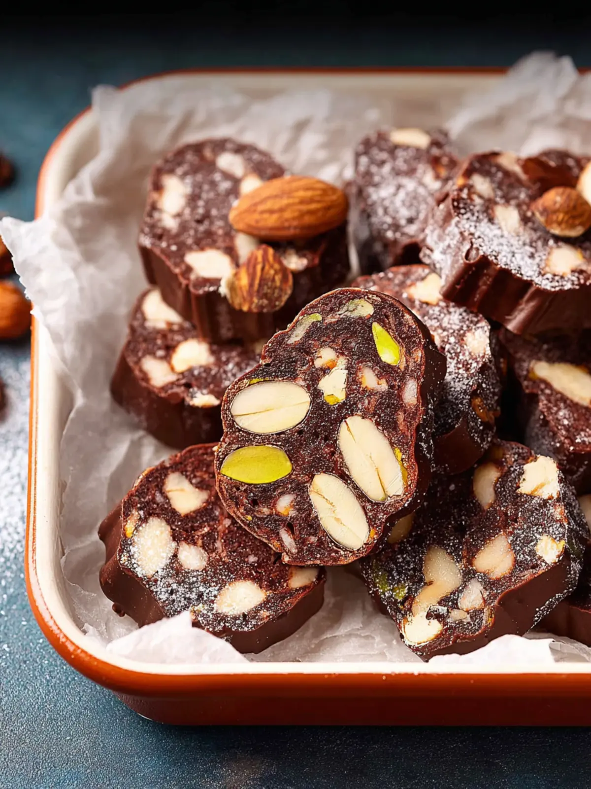 This recipe is a crowd-pleaser that is as visually striking as it is delicious. The beautiful presentation mimics a traditional salami, making it an excellent centerpiece for gatherings or a thoughtful homemade gift. As you slice into it, the swirls of chocolate mingled with nuts and biscuits reveal a feast for the eyes and taste buds alike.
