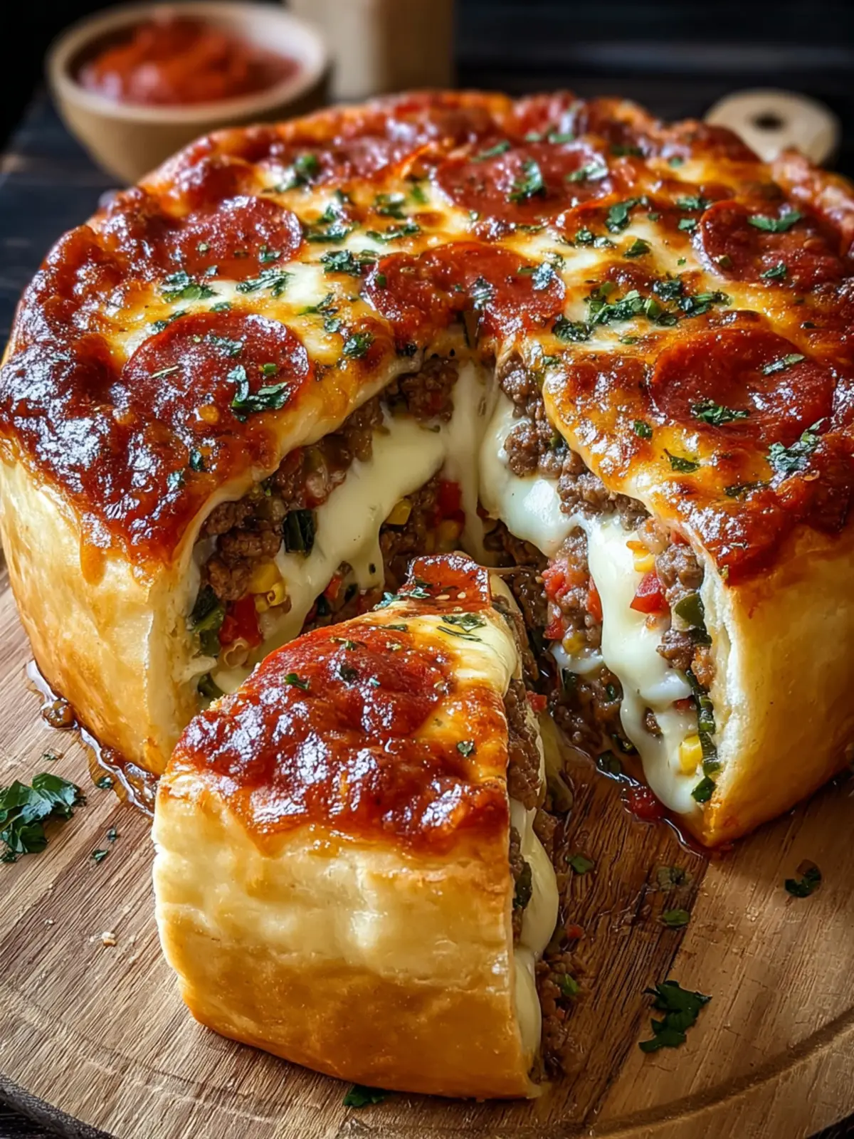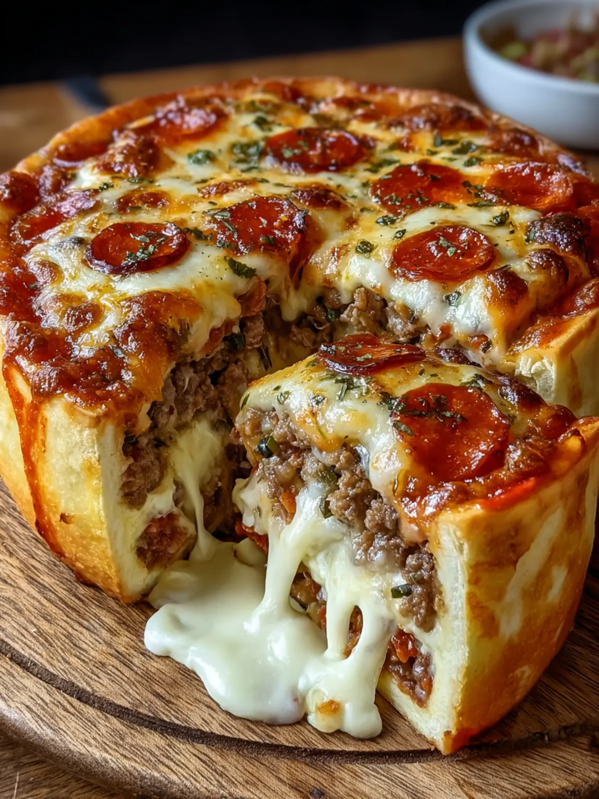 A delicious deep dish stuffed pizza pie filled with savory beef, mozzarella, and pepperoni.