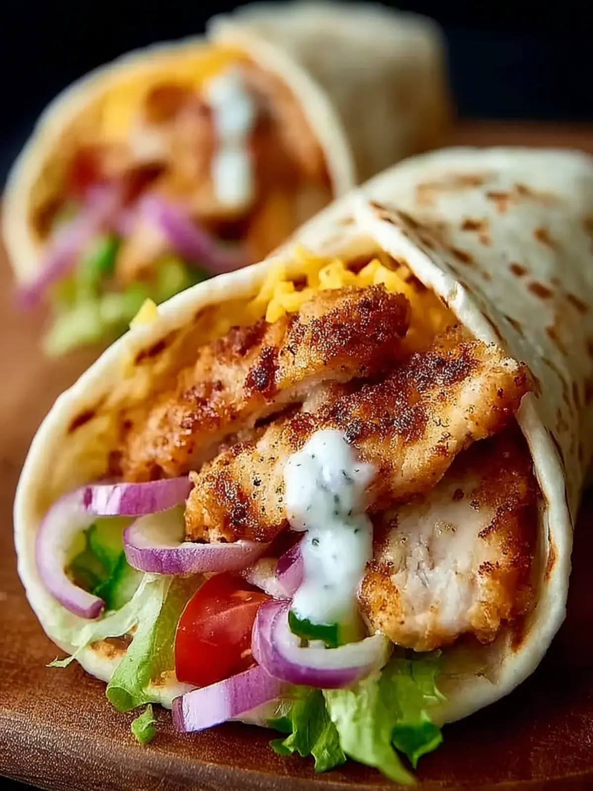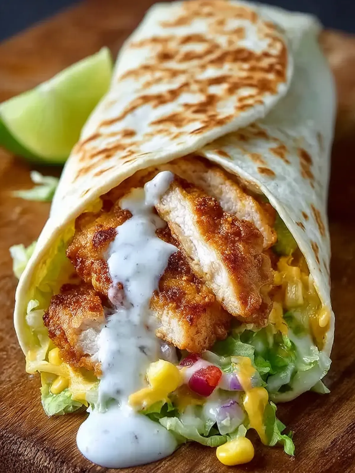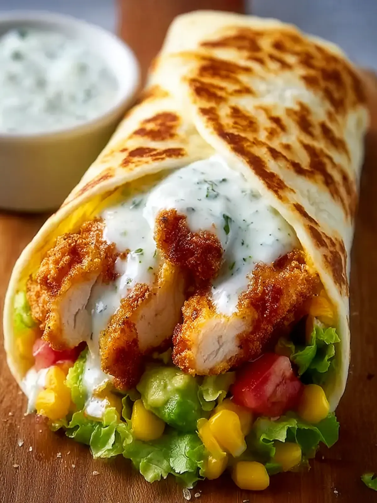A delicious wrap filled with crispy chicken tenders, fresh lettuce, cheese, and creamy ranch dressing.