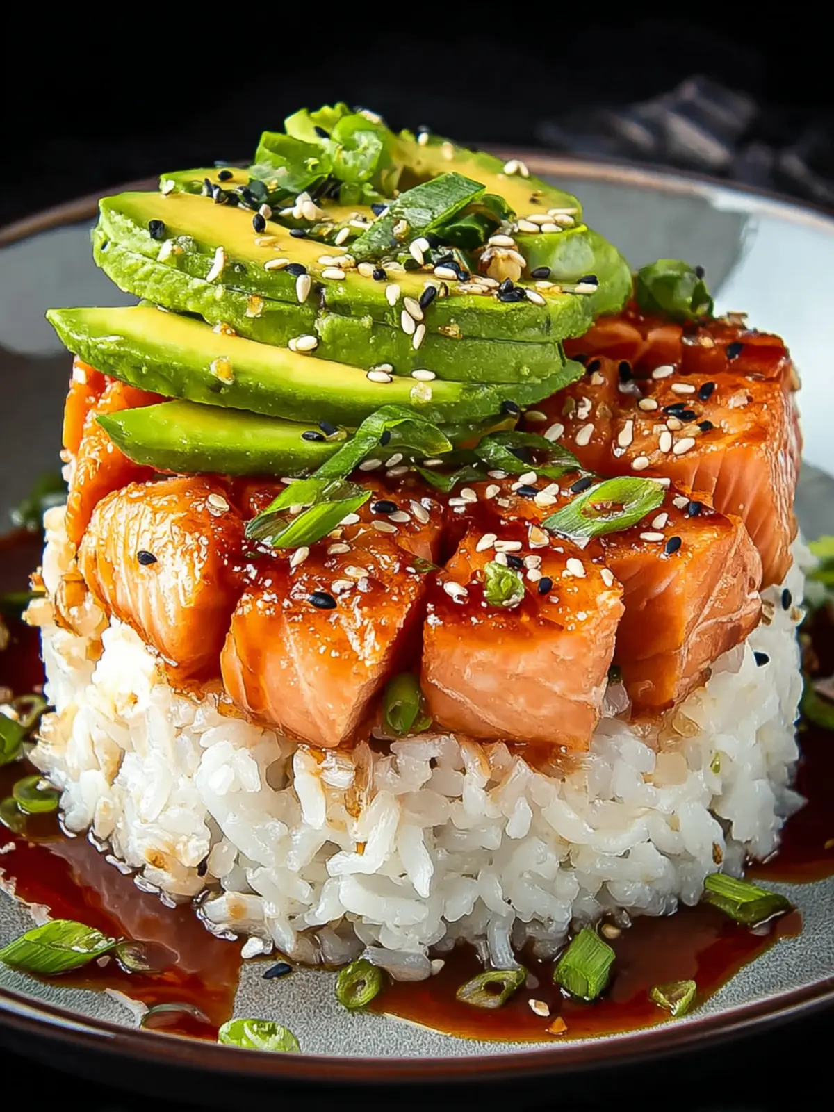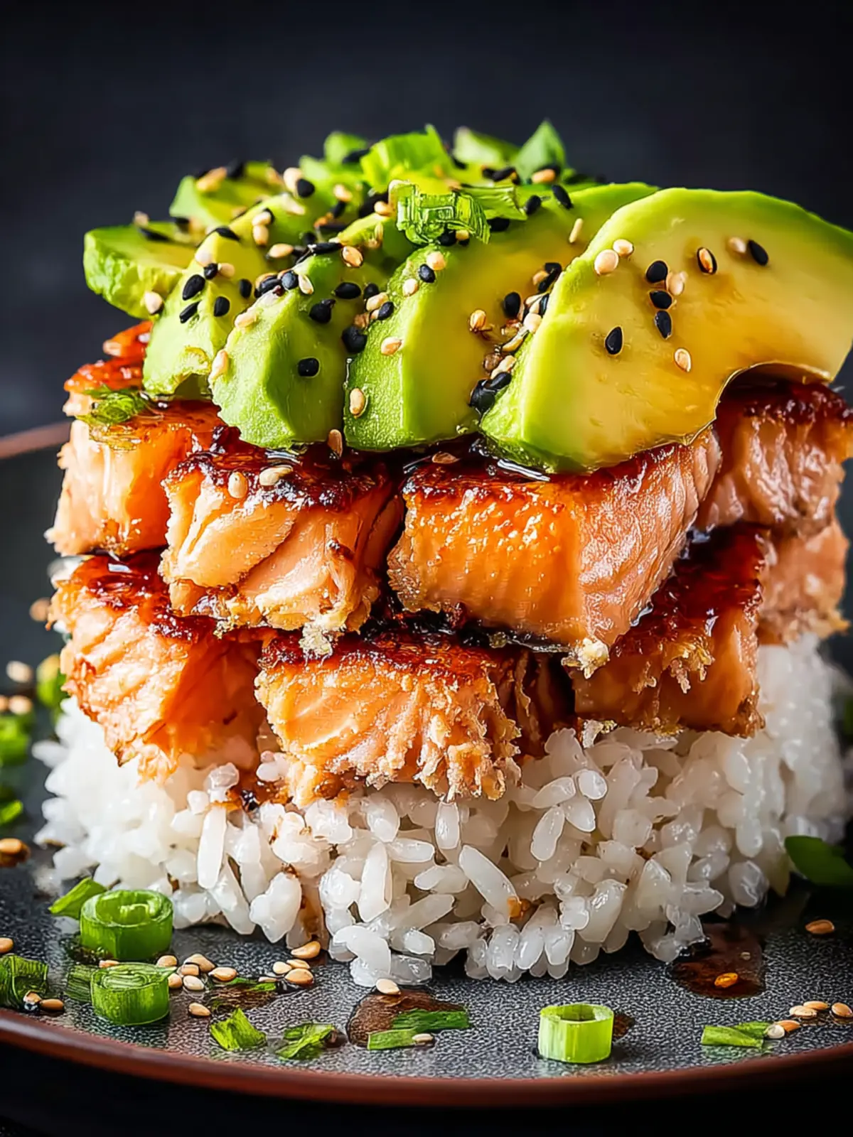 Irresistible Teriyaki Salmon: A Flavor-Packed Avocado Rice Stack