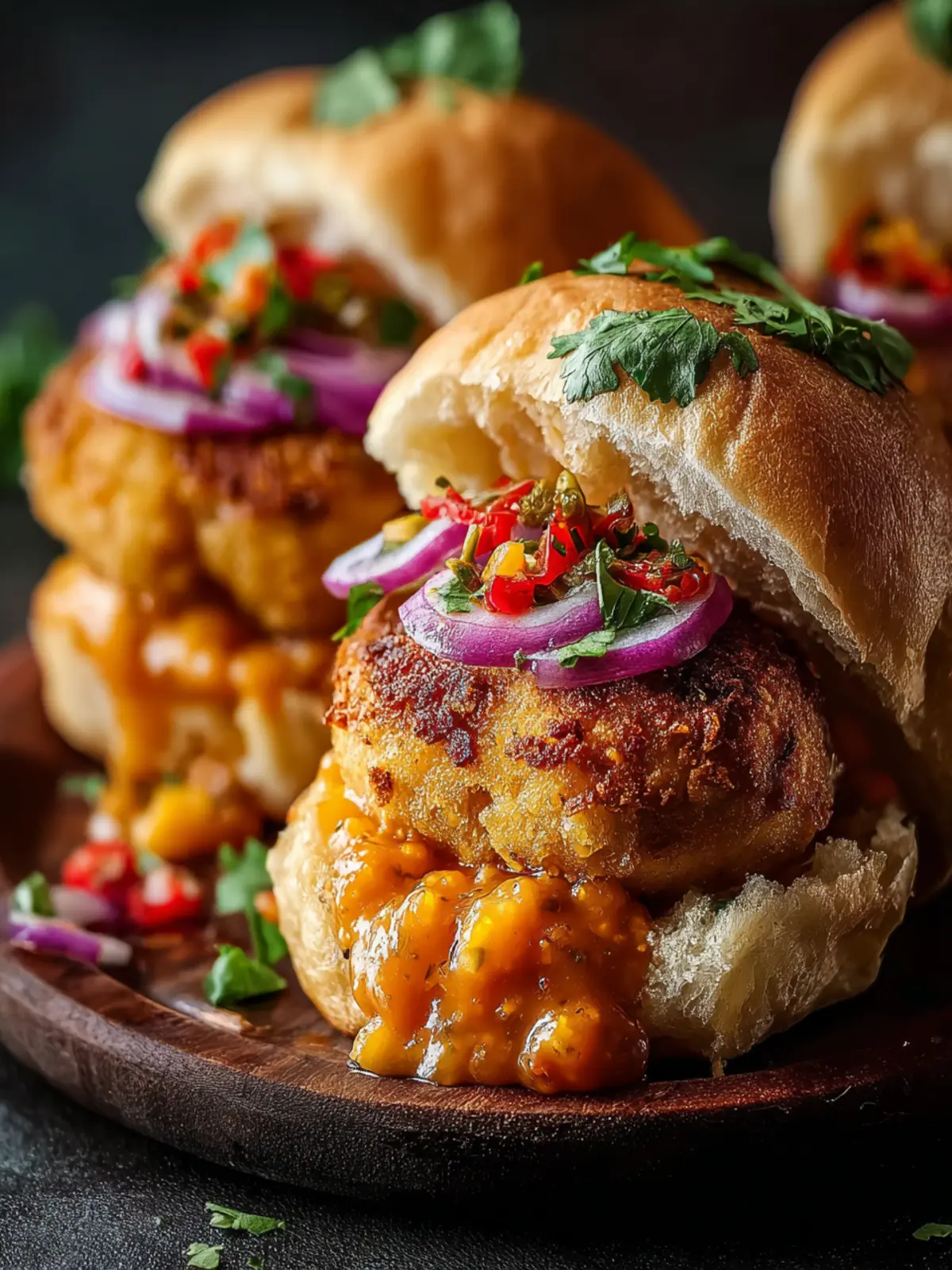 - Slice the pav buns in half and toast them lightly. Place a fried vada on the bottom half, add a generous dollop of Spiced Chutney, and cap with the top half of the bun. Serve immediately to enjoy the warmth and harmony of flavors!