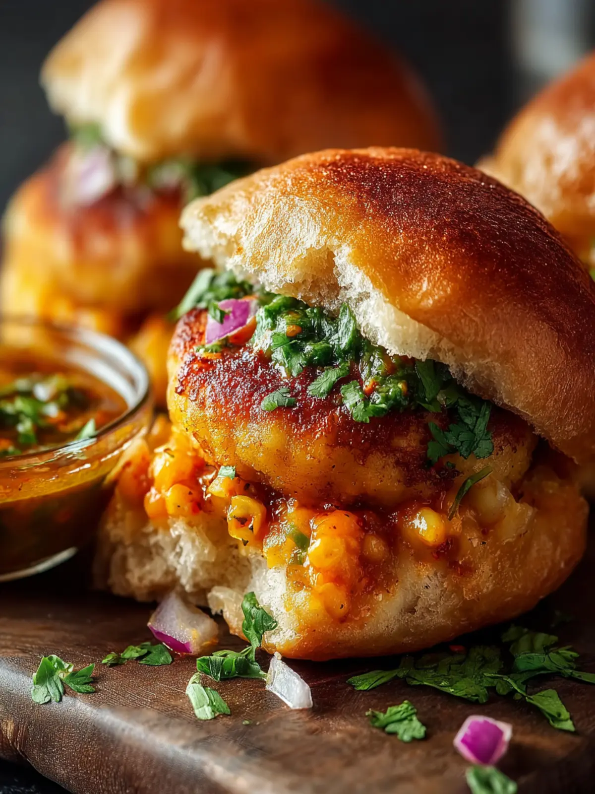 A delicious Indian street food combining spiced potato patties with soft pav buns served with chutney.