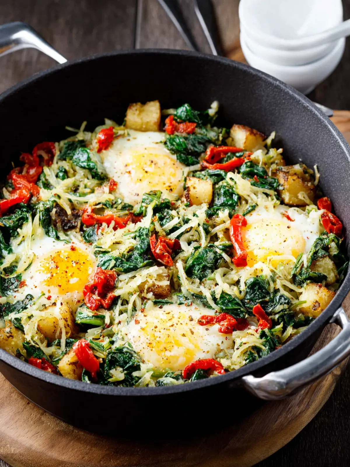 Nutrient-Dense Ingredients: The skillet is loaded with leafy greens like spinach, kale, and Swiss chard. These powerhouses are not only rich in vitamins and minerals but are also known to boost your energy levels and support overall well-being.
