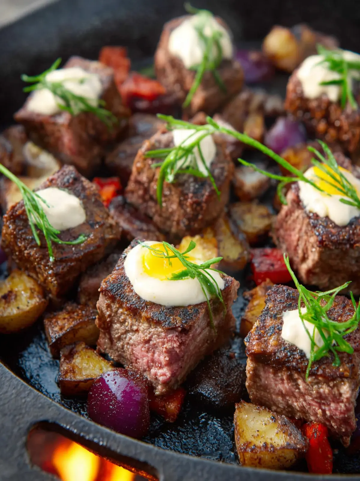 - Add the potatoes to the skillet and let cook for 5-7 minutes until they have browned and are crispy on the outside. When done, add the steak back to the skillet and make 3-4 divots for the eggs.